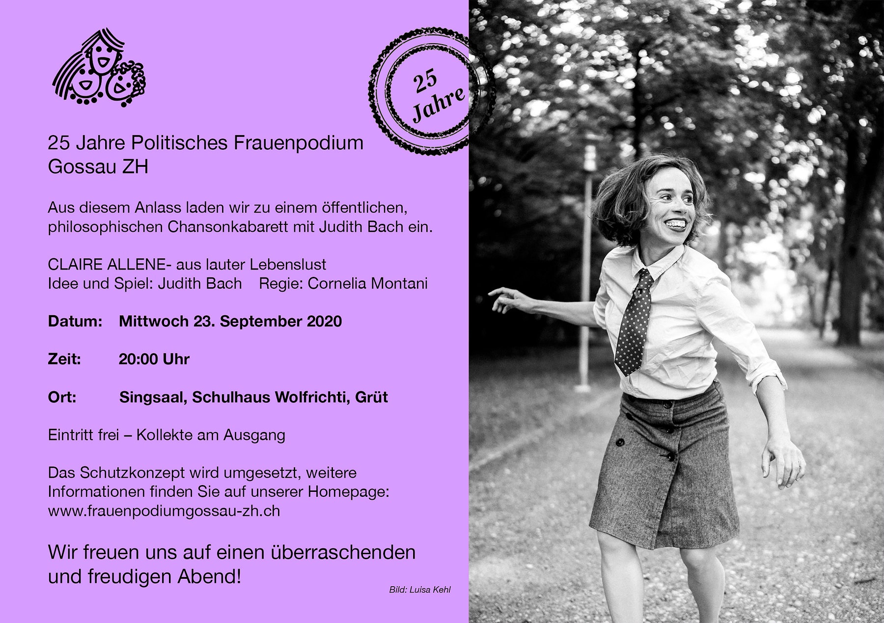 Chansonkabarett mit Judith Bach zu unserem 25-Jahr-Jubiläum – mehrfach Coronavirus geschützt, mit Kollekte am Ausgang. Flyer